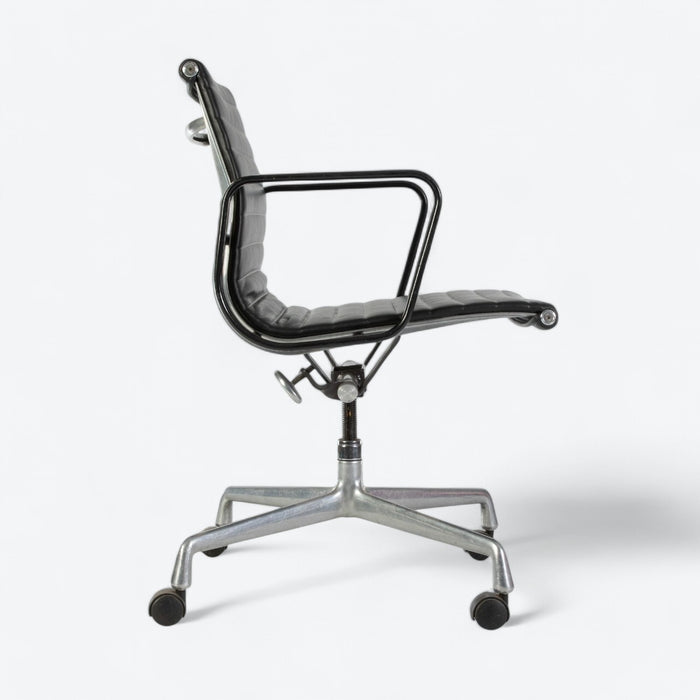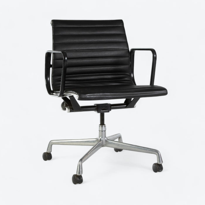 Produced alongside a mesh finished option, this style was the earliest of the Eames aluminium range originally intending to be used outside as well as indoors. It was soon realized that the design was better suited for indoor purposes and, more importantly, for the office environment within which they would find their fame.